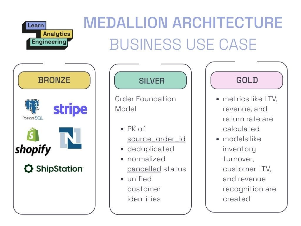 dbt is the engine that powers these transformations that helps to implement the logic for each layer, but it doesn’t define the overall architecture. Think of medallion as the road network your data drives on, and dbt as the engine under the hood.